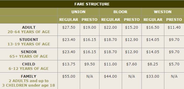 A regular fare will cost riders $27.50 if they are paying cash or $19 if they use the new electronic fare card system, Presto. There are a host of other discounts, including for students, seniors and (not listed here) for airport workers who can purchase a monthly pass for $300.