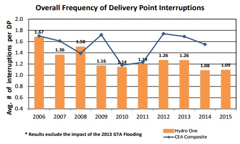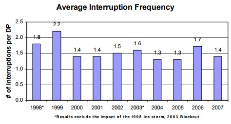Reliability statistics for Ontario’s transmission grid have been improving for nearly two decades – long before the province rushed into its transformation of Ontario’s electricity. The following two graphs show the average number of transmission “interruptions” in Ontario and were filed by Hydro One in applications before the Ontario Energy Board. Note that the data has been improving – fewer interruptions on the transmission grid – consistently over the last two decades.