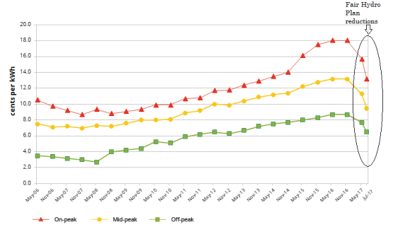 Whereas in Ontario, electricity prices have skyrocketed in recent years – excluding the recent artificial rate cut that occurred in May of this year that was a result of the Fair Hydro Plan. From November 2006 to November 2016, for example, the off-peak price of power increased by 155%.