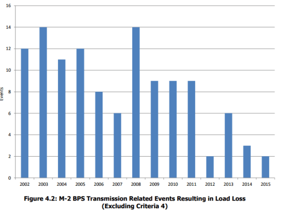 Yet, this isn’t just an Ontario story. It turns out transmission companies across North America have been getting more reliable over the last 15 years (at least), as shown in the following chart.